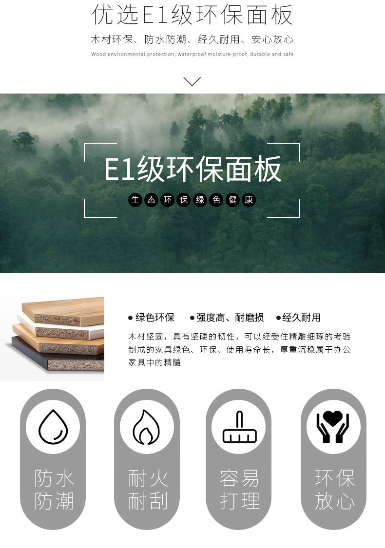 基 材:E1級(jí)達(dá)歐洲環(huán)保標(biāo)準(zhǔn)基材(目前國(guó)內(nèi)辦公家具行業(yè)板式基材標(biāo)準(zhǔn)較高的),此基材用原木壓縮顆粒成型,甲醛含量小于1.2MG/L,具耐磨、抗刻劃、耐高溫、易清潔、耐酸堿等優(yōu)點(diǎn),經(jīng)防蟲(chóng)、防腐處理,表面握釘力及靜曲強(qiáng)度均達(dá)到國(guó)家標(biāo)準(zhǔn);抗彎性能強(qiáng),不易變形。